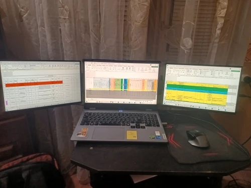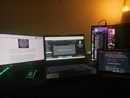 • A Twitch streamer uses one screen for OBS, one for chat, and the laptop for gameplay.